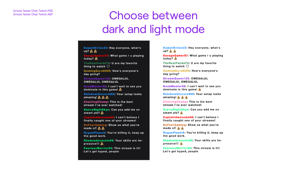 The sets are collected in PSD files (Photoshop). Inside you can select different layers, change the background image, and change the emote.